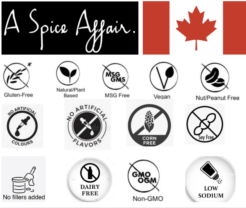 A proudly Canadian Company 🇨🇦 Our products are Gluten Free, Dairy Free, and Nut Free. We do not use fillers, additives or preservatives! We are also Soy Free, Colour Free, Corn Free, Low Sodium, MSG Free and Non GMO and Vegan!