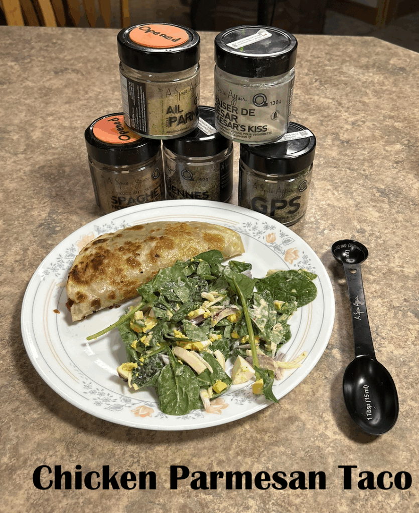 I did – fresh spinach, hard boiled egg. thinly sliced red onion and some grated mozzarella cheese and I would have added some sliced fresh mushrooms but I didn’t have any! Used A Spice Affair Caesar’s Kiss for the Caesar Dressing – a bit of mayo and a bit of spice and a splash of lemon juice and voila!
