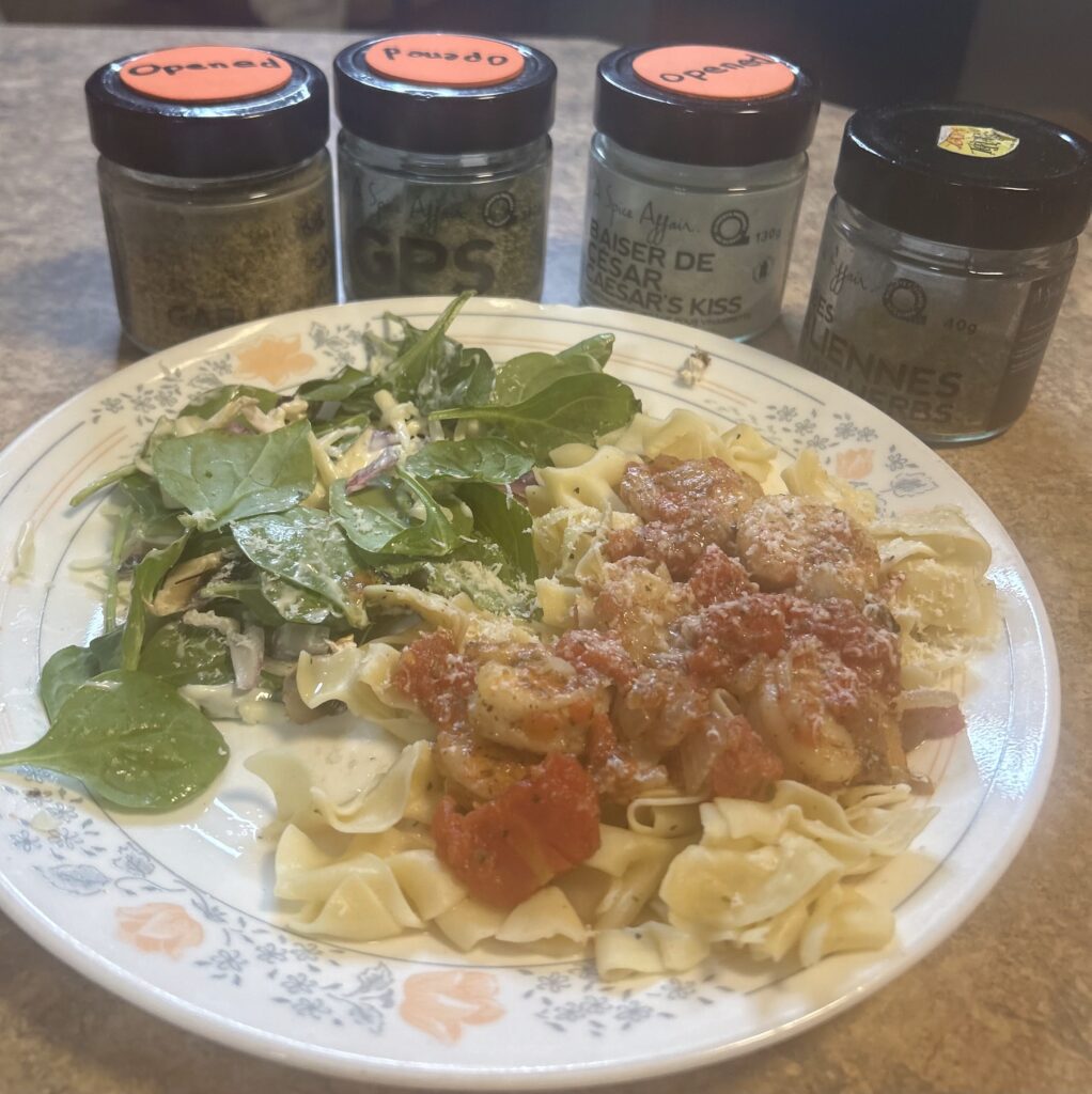 Heat up one large can of diced tomatoes with 1 Tbsp of Italian Blend. Let it simmer so it thickens a bit. Meanwhile sauté one onion with some GPS and then add in 1 package of shrimp. Add shrimp and onions to the tomatoes. Pour over top of cooked linguine or pasta of your choice. Top with some freshly grated Parmesan Cheese.